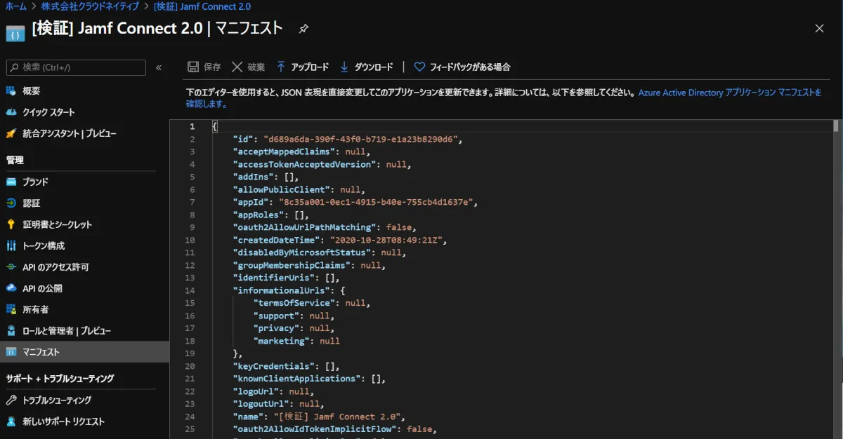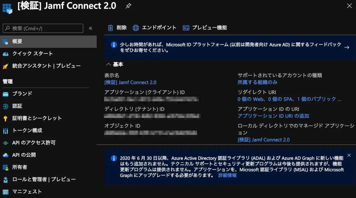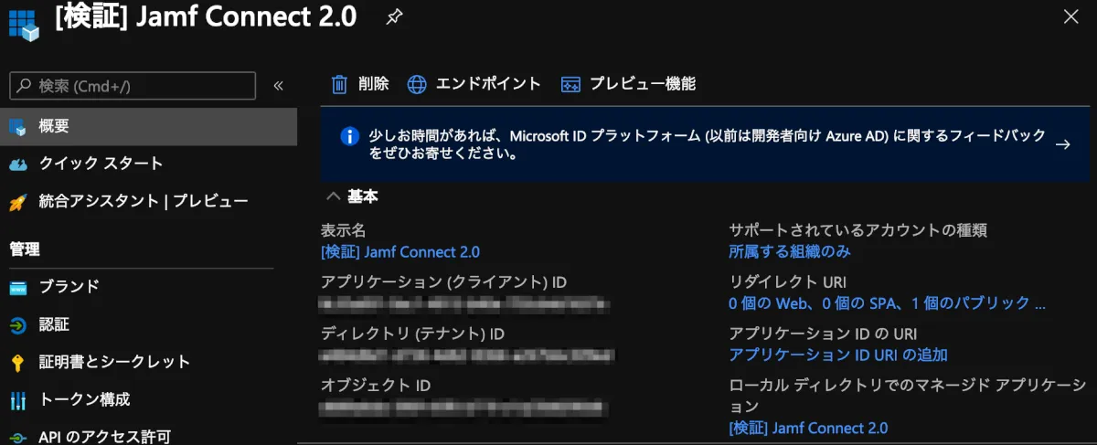 本スクリーンショットではモザイクを入れてますが、「アプリケーション(クライアント)ID」を次項目で紹介する「Jamf Connect Configuration」に入力する事でPLISTファイルを作成できます。