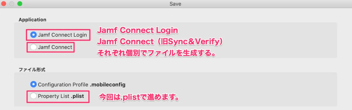 使いやすい形式を選択しましょう。今回は「.plist」形式にて作成します。 本プログラム(Jamf Connect Configuration)は Mac専用アプリケーションとなります。