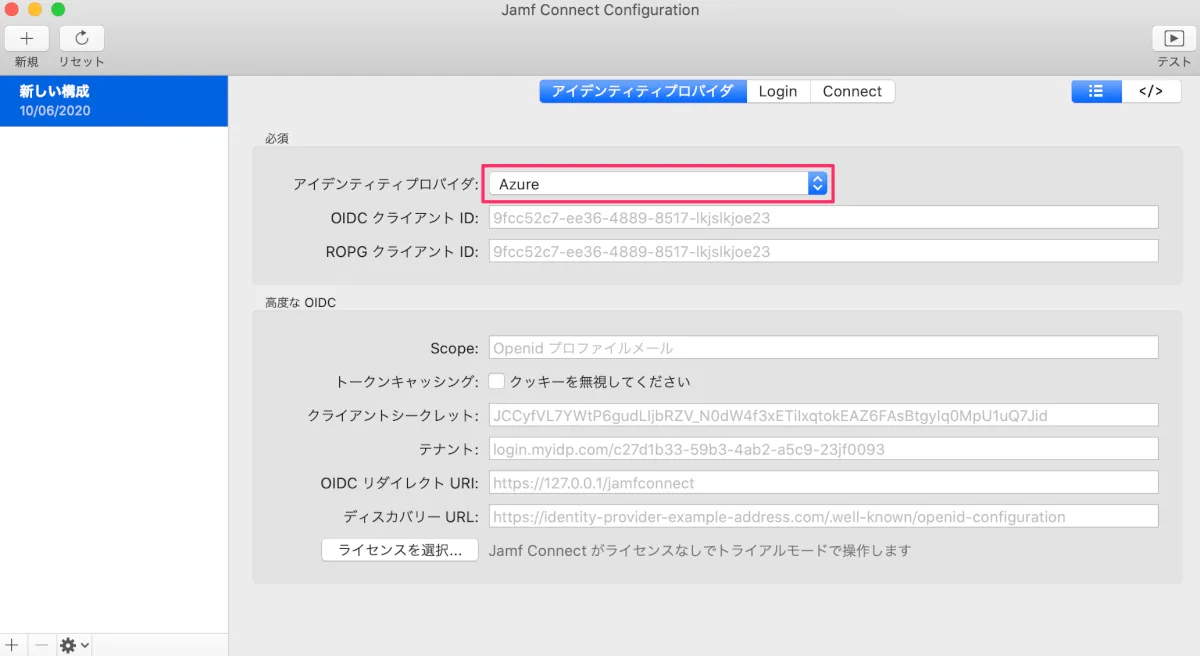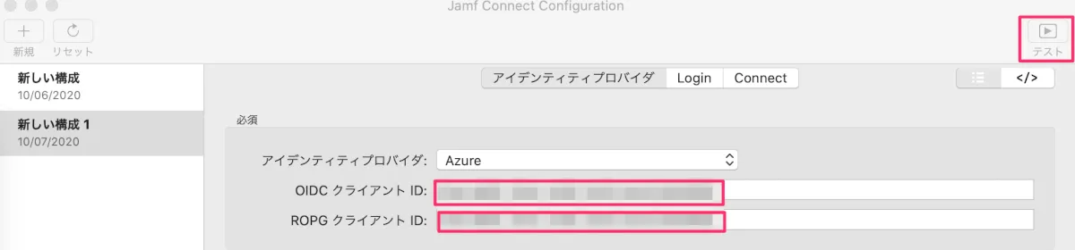 「OIDCクライアントID」と「ROPGクライアントID」はAzure ADの「アプリの登録」にて作成したプロファイル内に表示される「アプリケーション(クライアント)ID」を入力します。 紛らわしいですが、Azure AD上の「アプリケーション(クライアント)ID」 をJamf Connect Configurationの「OIDCクライアントID」、「ROPGクライアントID」に入力します。