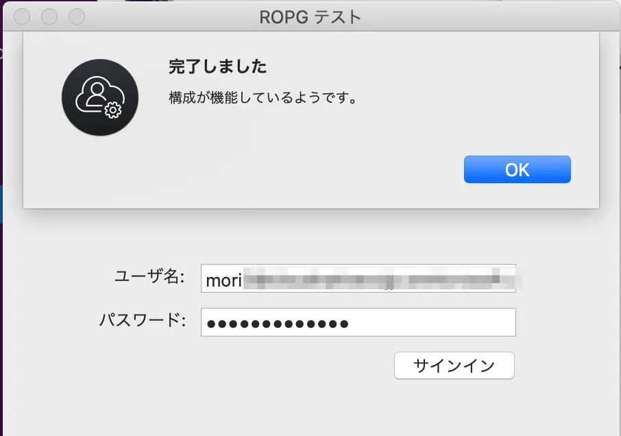 テストの様子 ボタンをクリックすると、それぞれのテストが実行できます。設定が正しく、認証ができると「完了」となります。このテスト機能で動作チェックが数十秒で完了するため、Jamf Proでプロファイル作成や配信設定を行い、実機確認を行う事を考えると、大幅な作業時間の短縮が見込めます。
