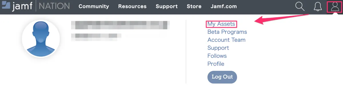 - Jamf NationアカウントでJamf Nationにログインし、右上の「account」からメニューを開き「My Assets」をクリックします。