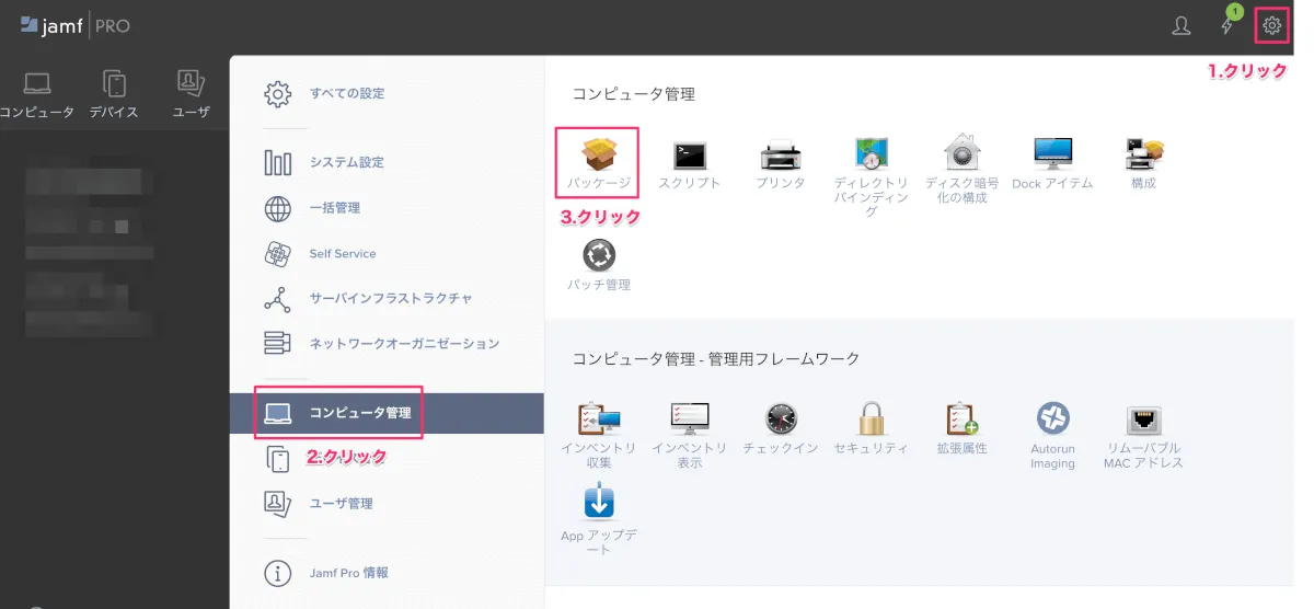 端末で使用するアプリをJamf Proへアップロードします。まずはJamf Proを開き、右上の歯車マークの 設定 > コンピュータ管理 > パッケージ(画像内1,2,3)の順でクリックし、パッケージファイル管理画面を開きます。