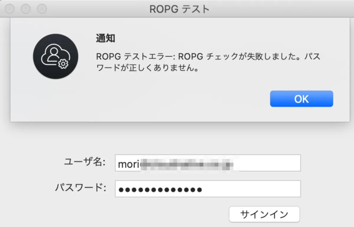 正しく認証出来なかった場合、以下の画面のようにエラーが出て弾かれます。また、エラーメッセージ内にエラーコードが表示される事もあります。エラーメッセージ内にエラーコードが表示されている場合はエラーコードでWeb検索すると、解決の糸口が掴めるかもしれません。