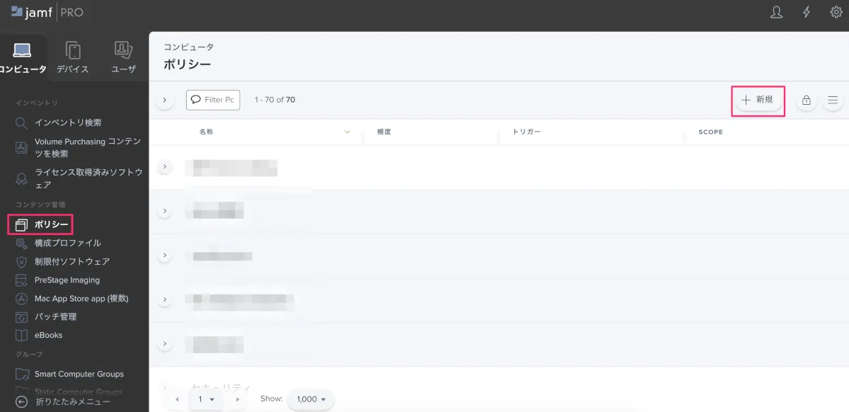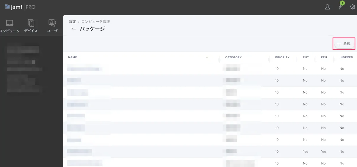 前章でJamf Connectパッケージファイルのアップロードが出来ましたので、続いてパッケージファイルを該当端末に配布する為のポリシーを作成します。Jamf Proのホーム画面より、「ポリシー」を開き画面右上の「+新規」よりパッケージファイル配布ポリシーを作成します。