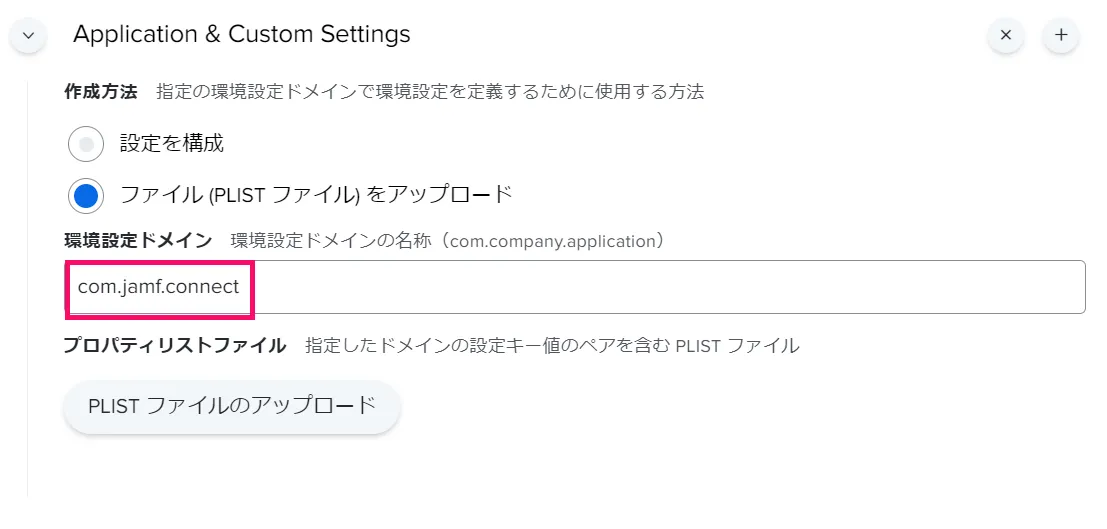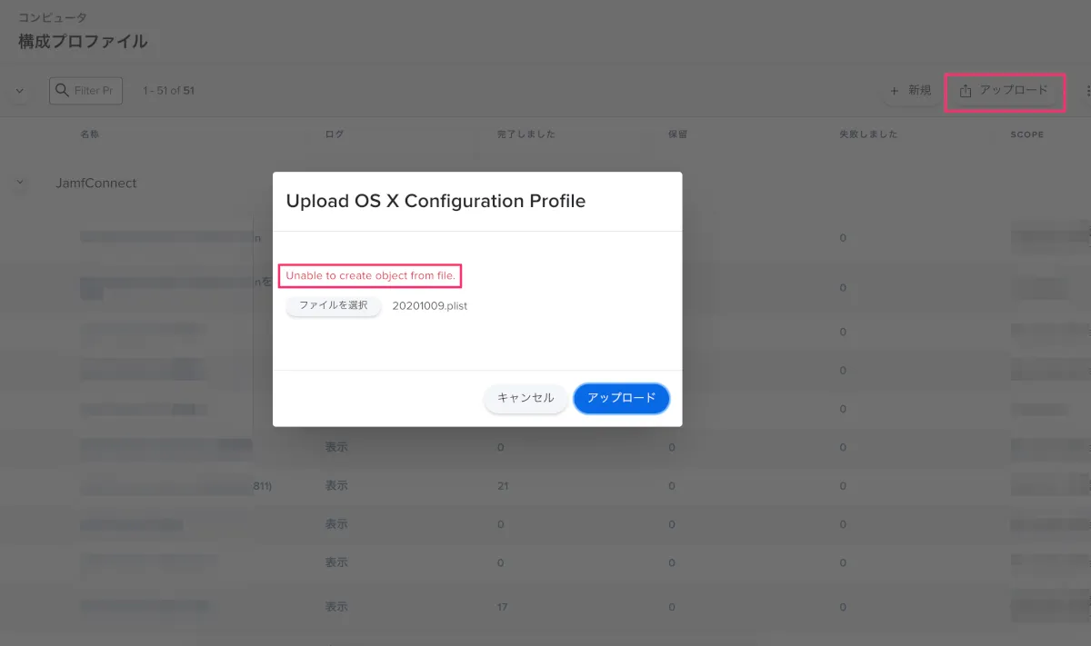 PLISTアップロード時の注意点 プロファイル作成時に表示される画面上部の「アップロード」ボタンよりファイル選択した場合、エラーとなり弾かれてしまいます。(こちらは構成プロファイルmobileconfigファイルをアップロードする際に利用します。)