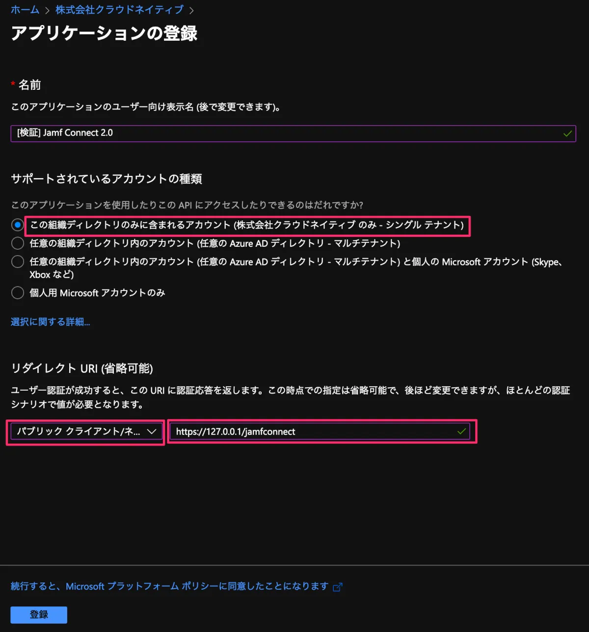 「サポートされているアカウントの種類」と「リダイレクトURI」を下記画像同様に選択し「https://127.0.0.1/jamfconnect」と入力し、登録を進めます。