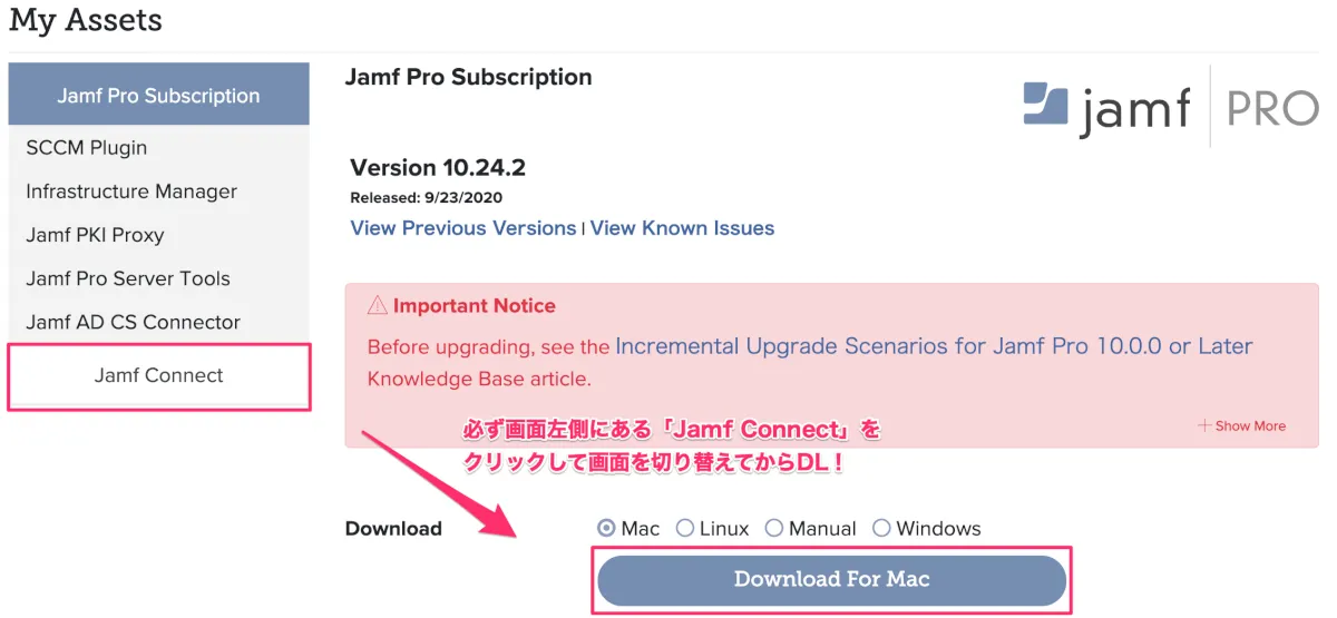 - 画面が切り替わり、Jamf Connect 2.0 のダウンロードリンクが画面左側に表示されます。最初は「Jamf Pro」が選択されている為、左側に表示されている「Jamf Connect」をクリックし、画面を切り替え、ダウンロードボタンより、パッケージファイルをダウンロードします。