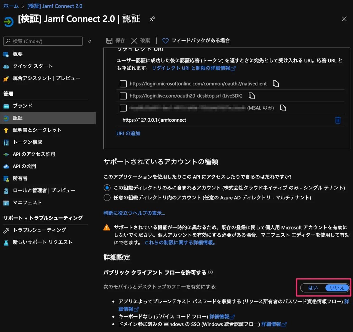 画面下「パブリック クライアント フローを許可する」 が標準では「いいえ」になっているため、「はい」に変更します。