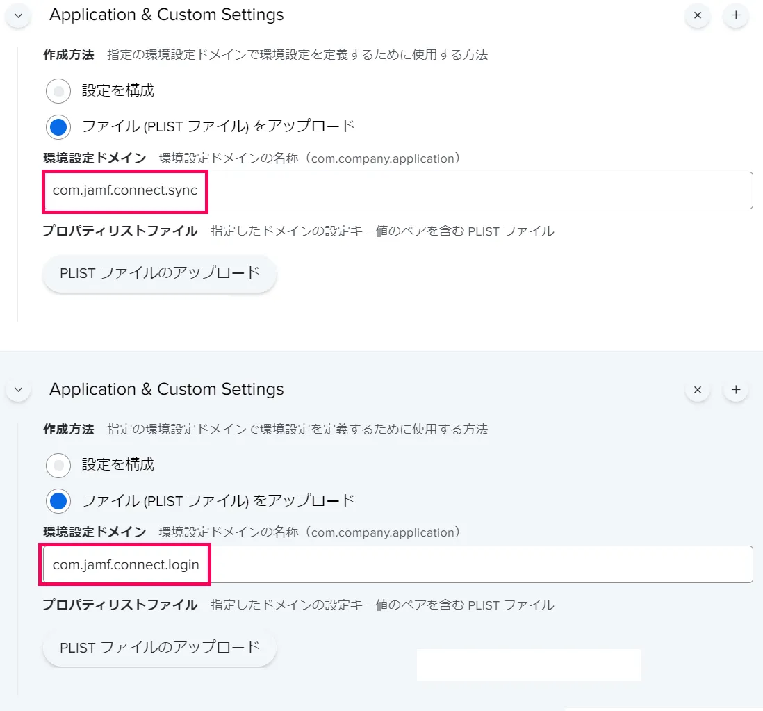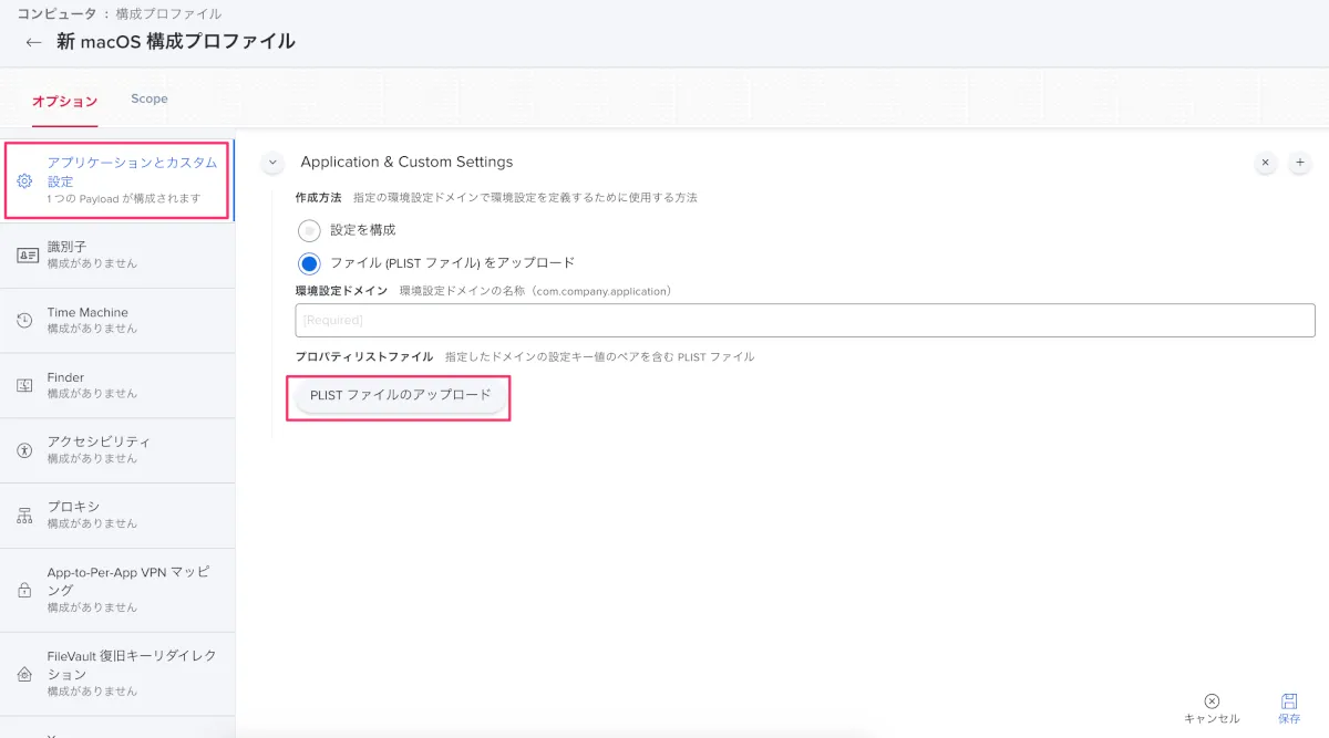 「.plist」形式にてそれぞれのプロファイル(ファイル名変更不可)を保存し、Jamf Proにアップロードします。