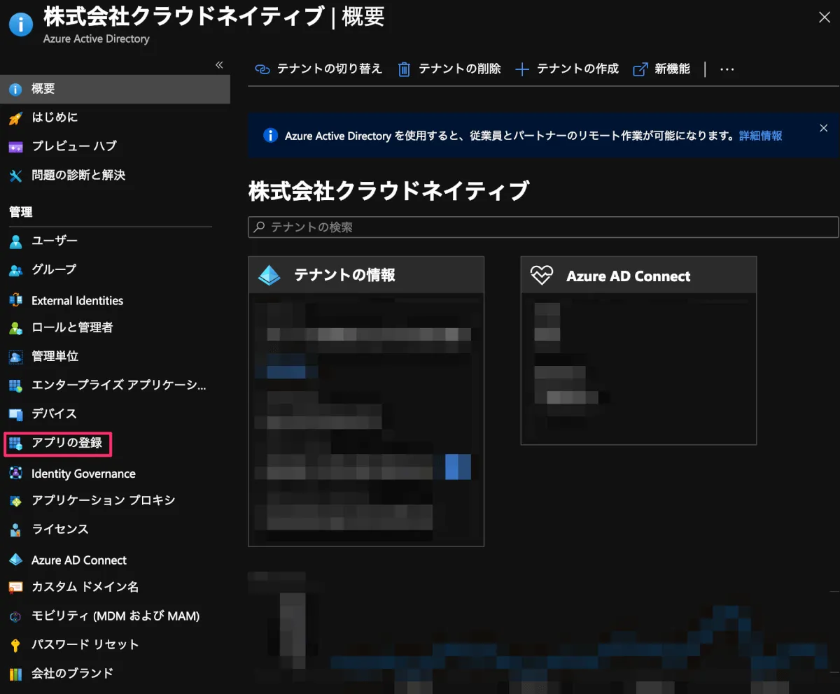 「Azure AD」メニュー内「アプリの登録」内「新規作成」より登録を進めます。