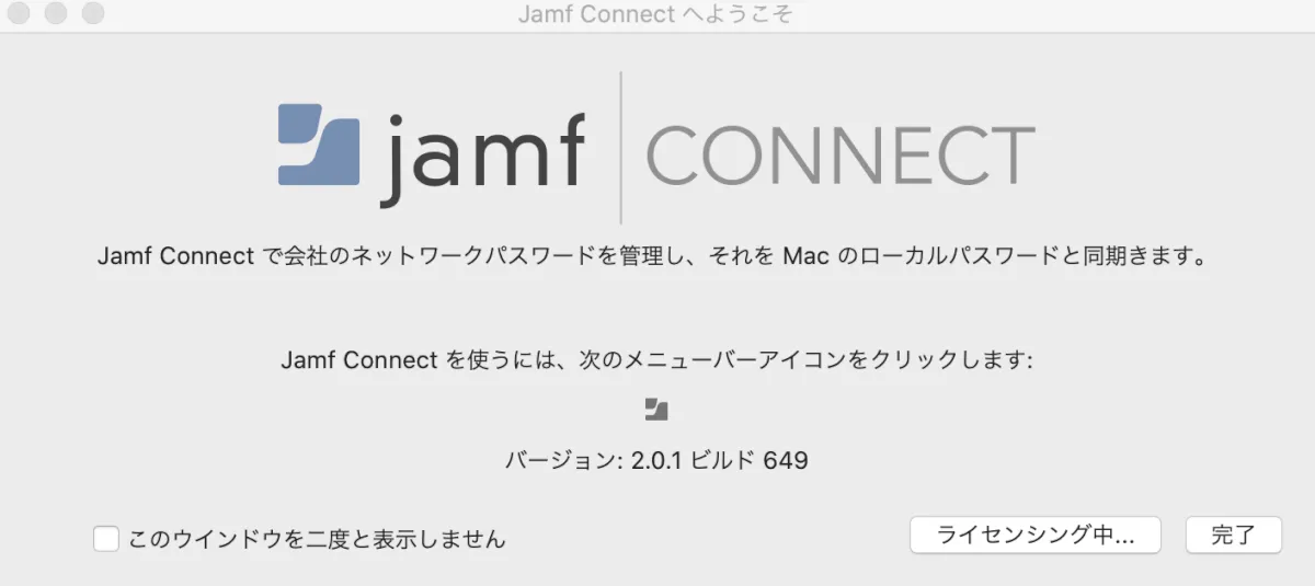 ログイン後に再度認証のポップアップが表示されていましたが、2.0へのアップデートでJamf Connect Login と連動することで、ログイン後の追加認証が不要となりました。
