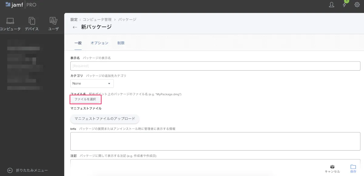 画面中央の「ファイルを選択」ボタンより「JamfConnect.pkg」ファイルをアップロードします。表示名を入れなくても、パッケージファイルをアップロードする事で自動で表示名が入力されます。その他の項目は入力必須ではありませんが、注記などにVersionや日付などを入れておくと管理しやすくなります。