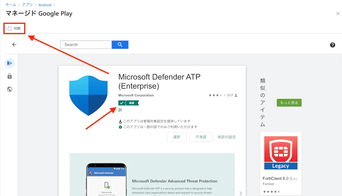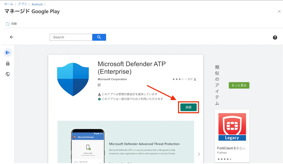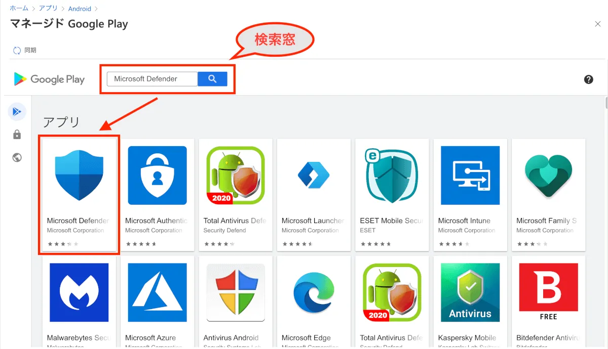 - マネージド Google Play画面に移行するので、検索窓に「Microsoft Defender」や「MDATP」などのワードを入力し、表示された”Microsoft Defender ATP”をクリックします。