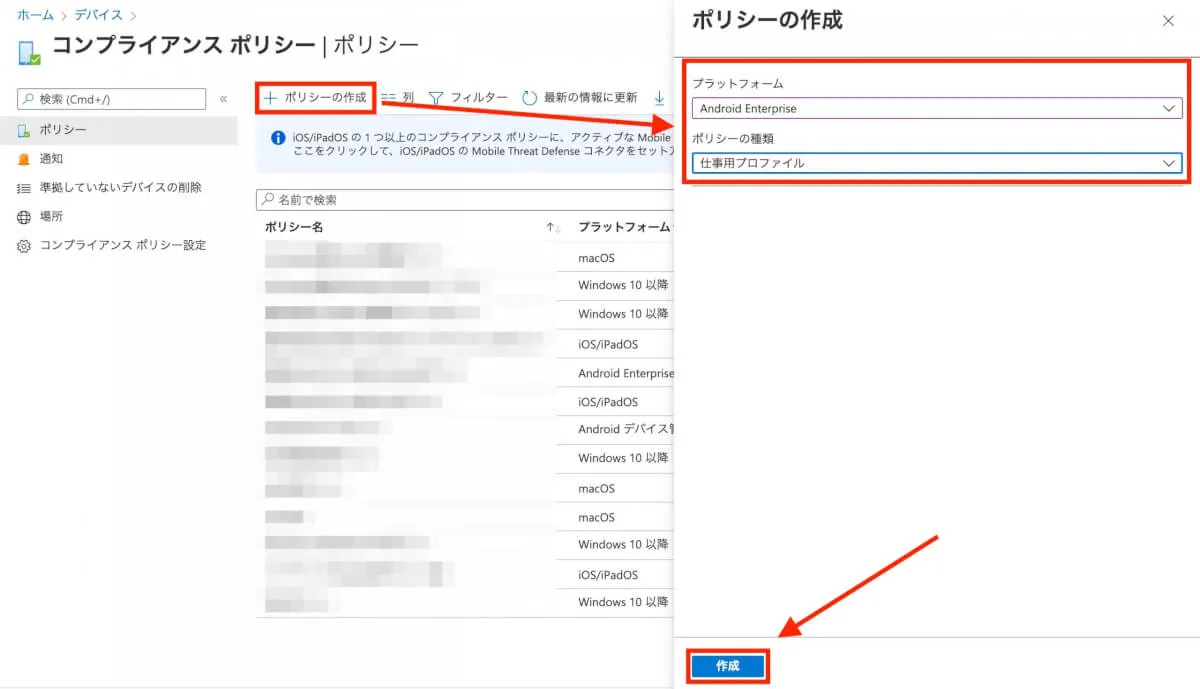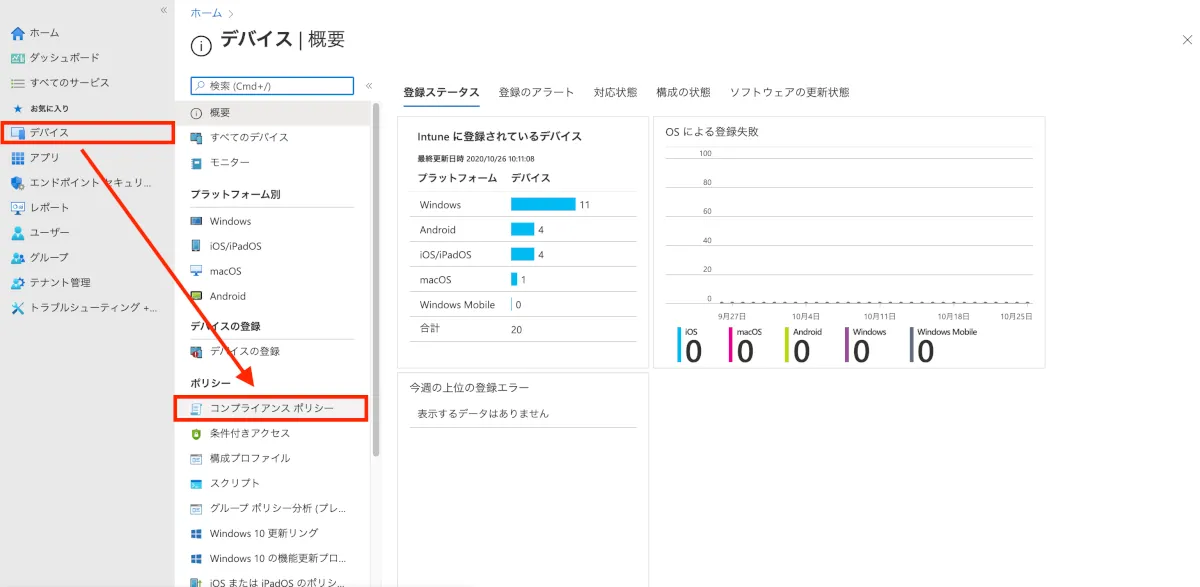 - 続いて、デバイス > コンプライアンスポリシー をクリックします。