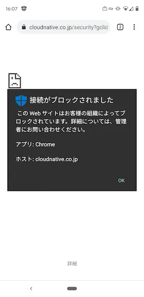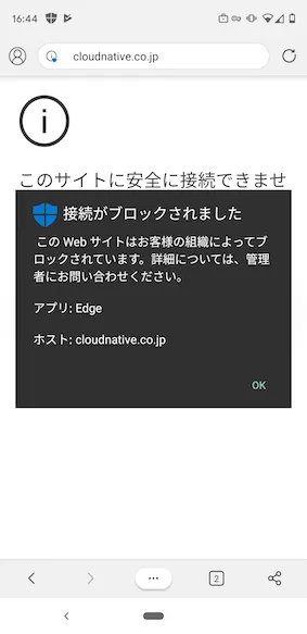 - アクセスしようとするとこのような表示でブロックされたことが確認できます。
