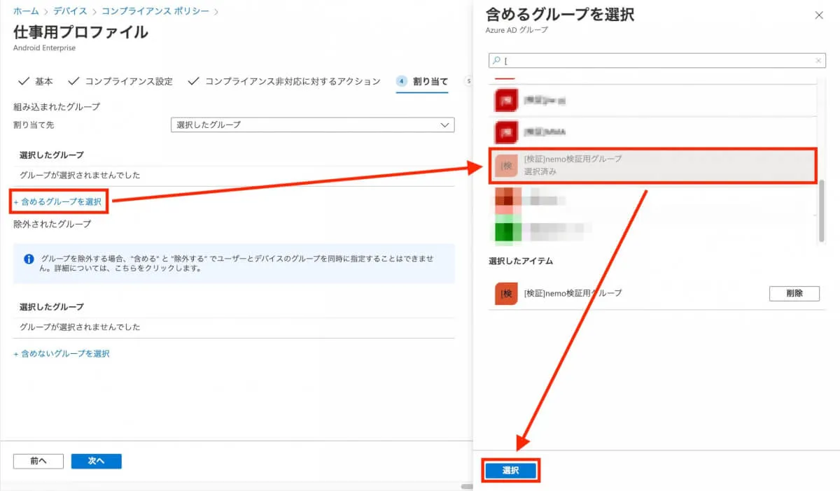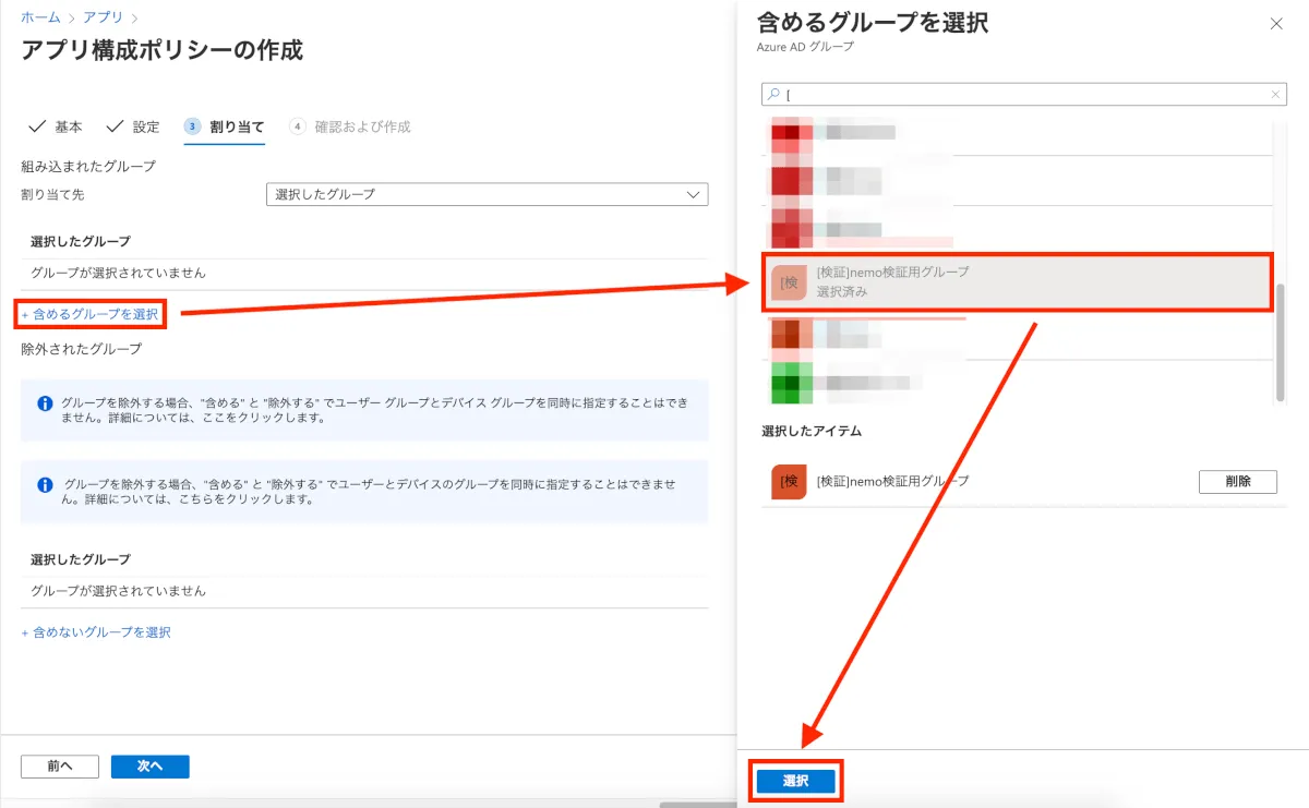 - “+含めるグループを追加”を選択し、設定を割り当てるAzure ADグループを設定した後、”選択”をクリックします。