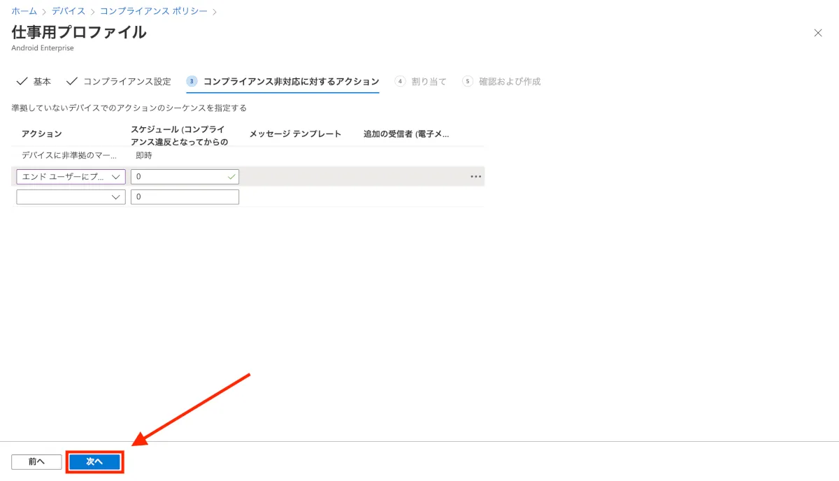 - コンプライアンス非対応に対するアクションタブが表示されるので、任意の設定を行い、”次へ”をクリックします。(今回は「エンドユーザーにプッシュ通知を送信する」を追加しています。)