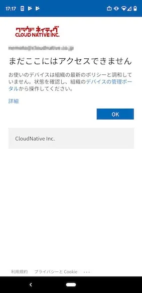 - 当然、社内リソースにアクセスしようとした段階で、条件付きアクセスに引っかかります。