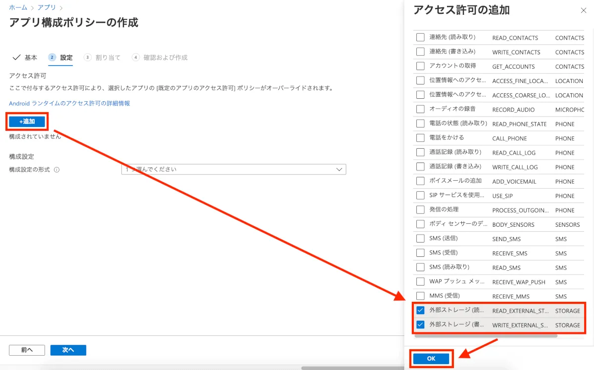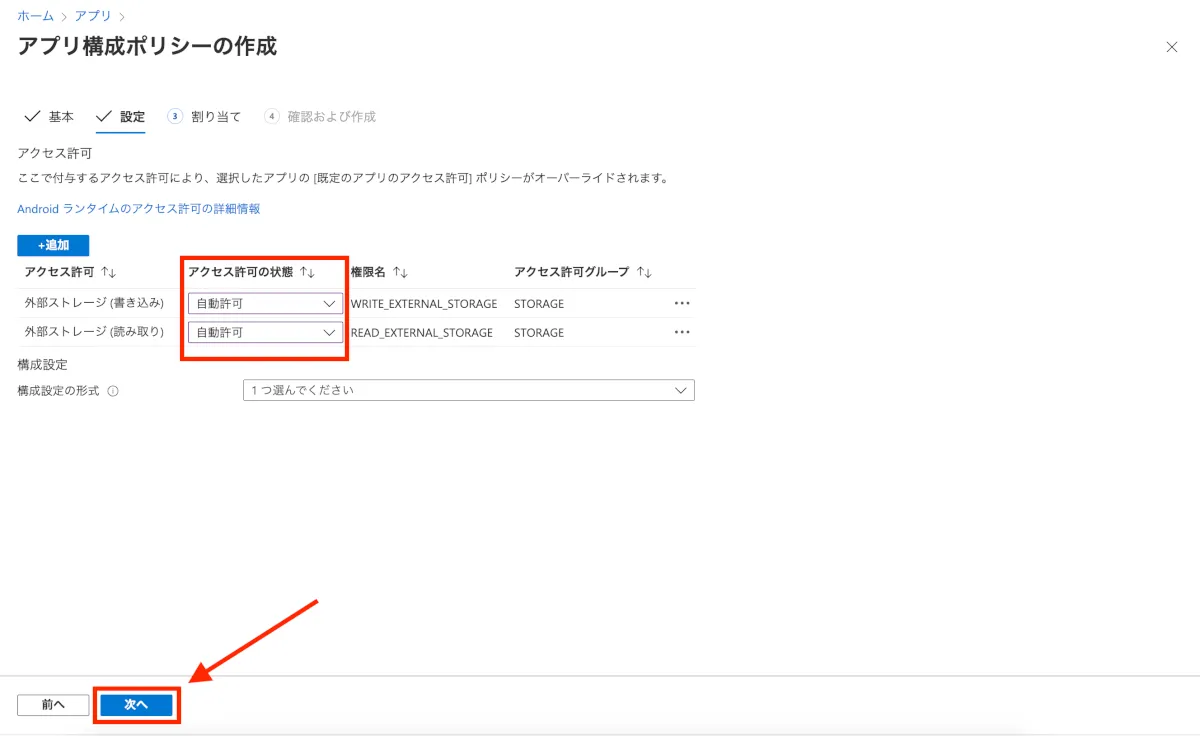 アプリ構成ポリシーを設定し、デバイスへのアクセス許可を付与していきます。 この設定をすることでユーザーがアクセス許可を承諾することなく配布することができます。