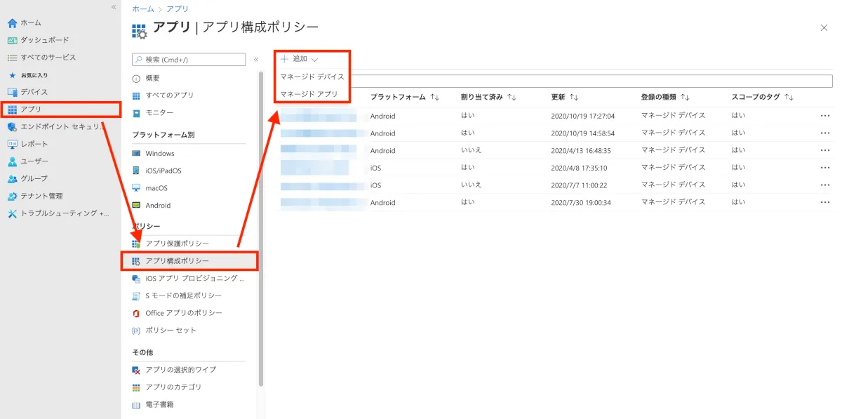 - アプリ > アプリ構成ポリシー > +追加 をクリックし、プルダウンメニューから”マネージドデバイス”を選択します。