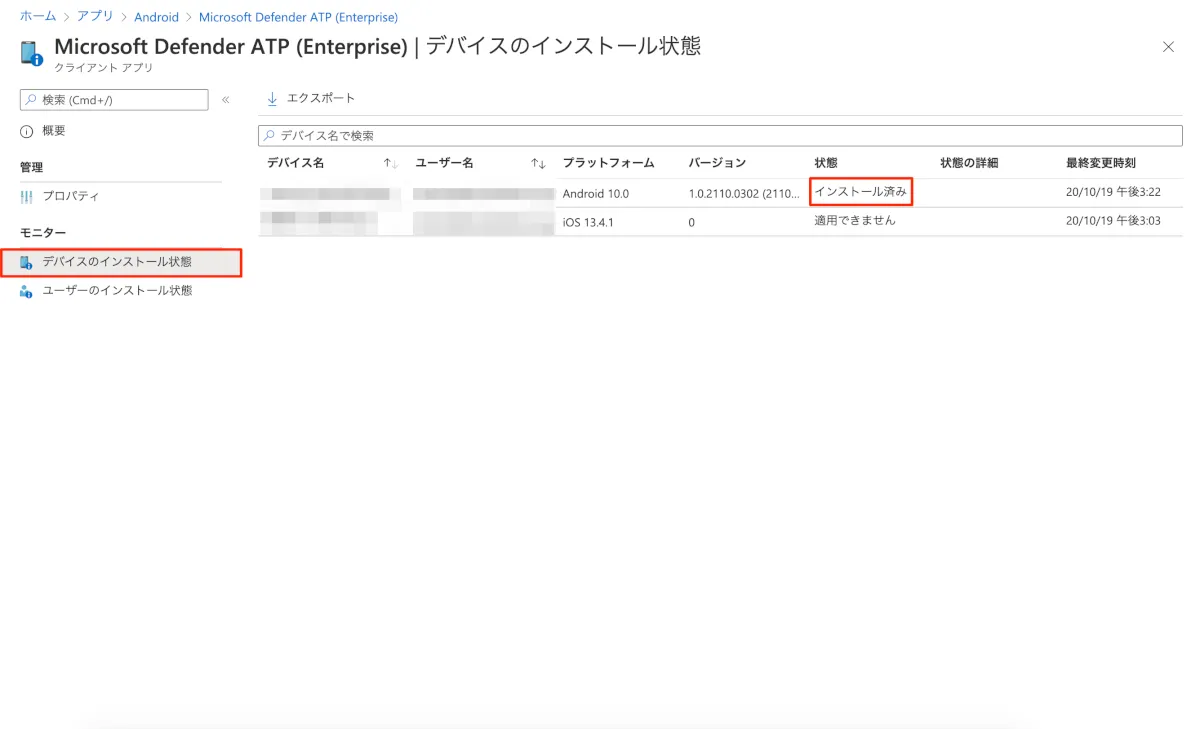 - “デバイスのインストール状態”をクリックすると、割り当てられているデバイスのインストール状況が確認できます。状態が「インストール済み」となっていたらインストール完了です。