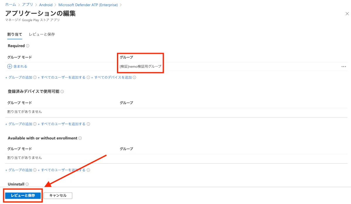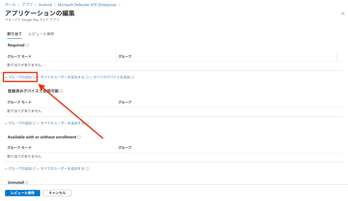 - 選択したグループが追加されていることを確認し、左下の”レビューと保存”をクリックします。
