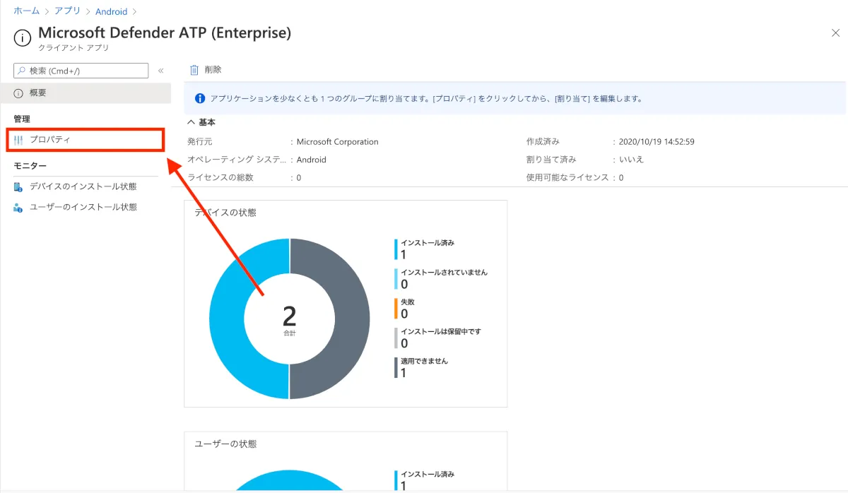 - Microsoft Defender ATPの概要画面に遷移するので、”プロパティ”をクリックします。