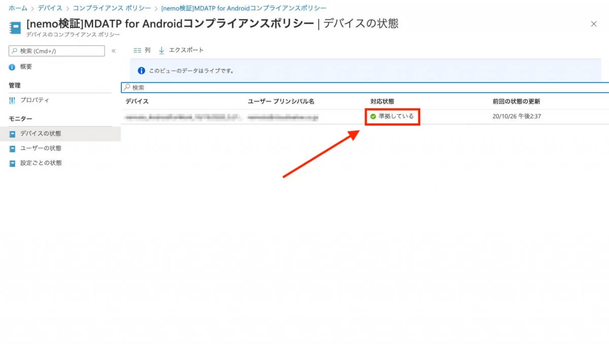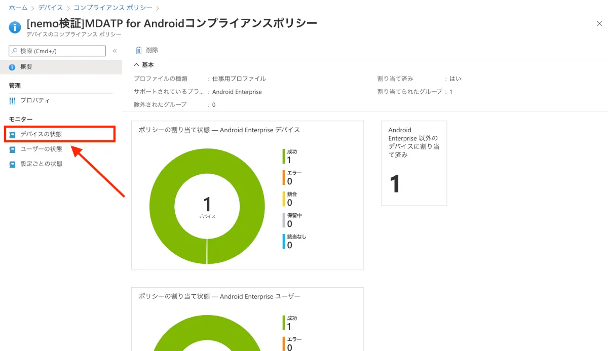- すると作成したコンプライアンスポリシーのダッシュボード画面が表示されます。しばらく待ってからブラウザを更新すると、正常に割り当てがされていることが確認できます。詳細を確認するには”デバイスの状態”をクリックします。