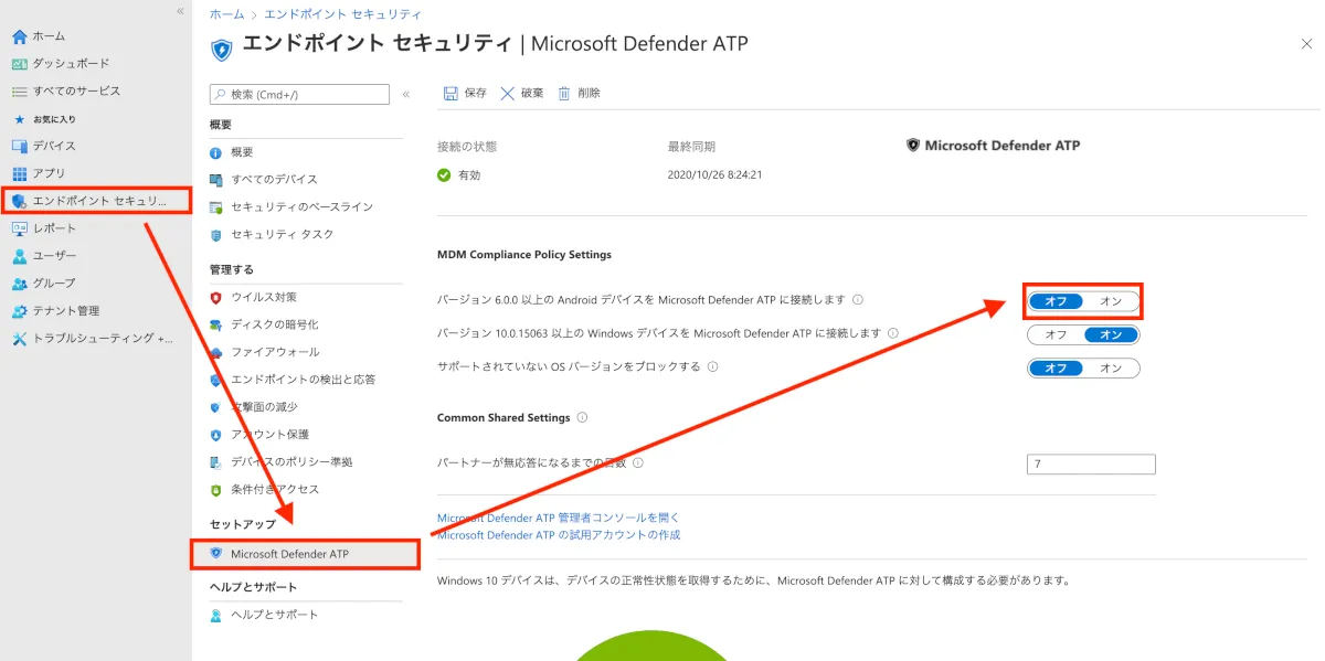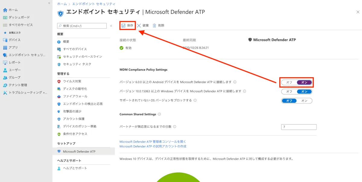 - Microsoft Endpoint Managerより、エンドポイントセキュリティ > Microsoft Defender ATP > 「バージョン6.0.0以上のAndroid デバイスを Microsoft Defender ATP に接続します」を”オン”に変更します。