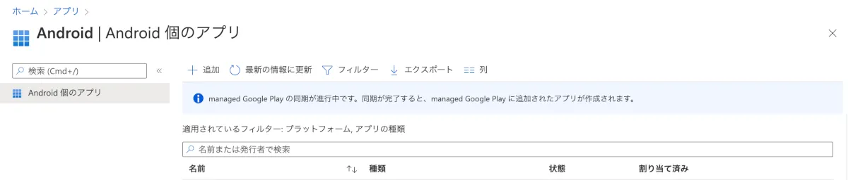 - するとアプリケーションの一覧画面に遷移し、「managed Google Play の同期が進行中です。同期が完了すると、managed Google Play に追加されたアプリが作成されます。」と表示されているのが確認できます。