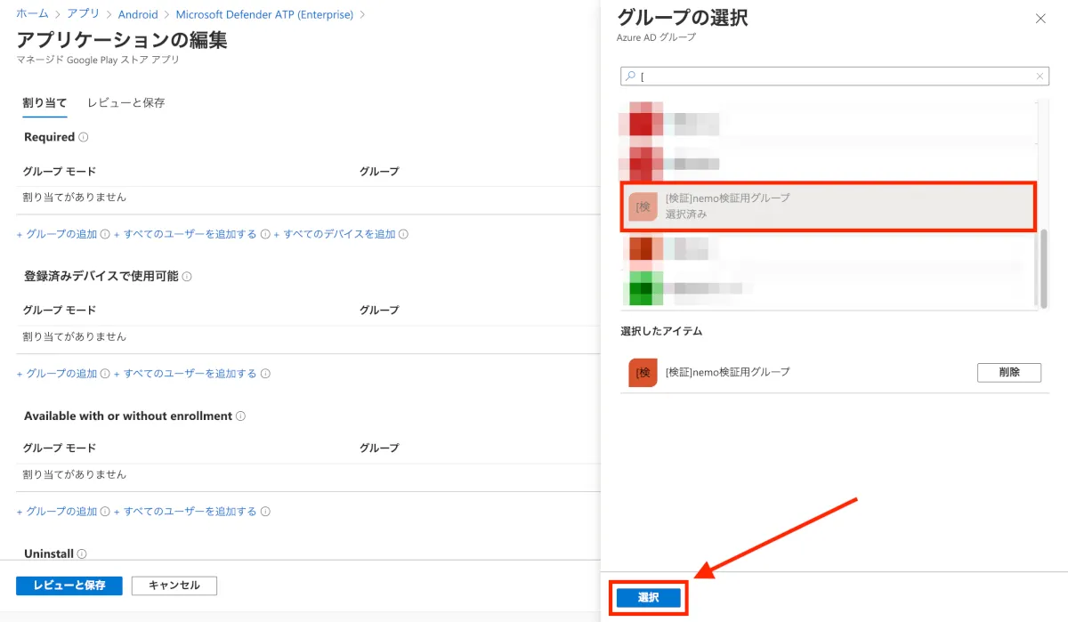 - 「グループの選択」ウィンドウが表示されるので、デバイスを割り当てたいAzure ADグループを設定した後、”選択”をクリックします。