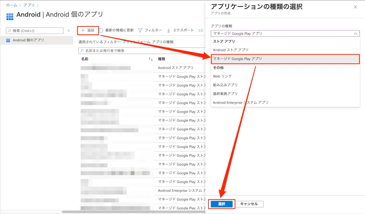 - “+追加” > アプリの種類のプルダウンを”マネージド Google Play アプリ”に変更し、”選択”をクリックします。