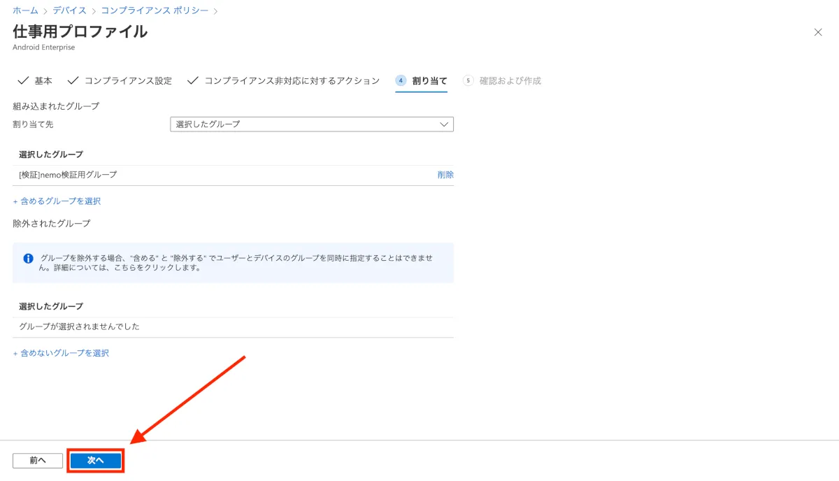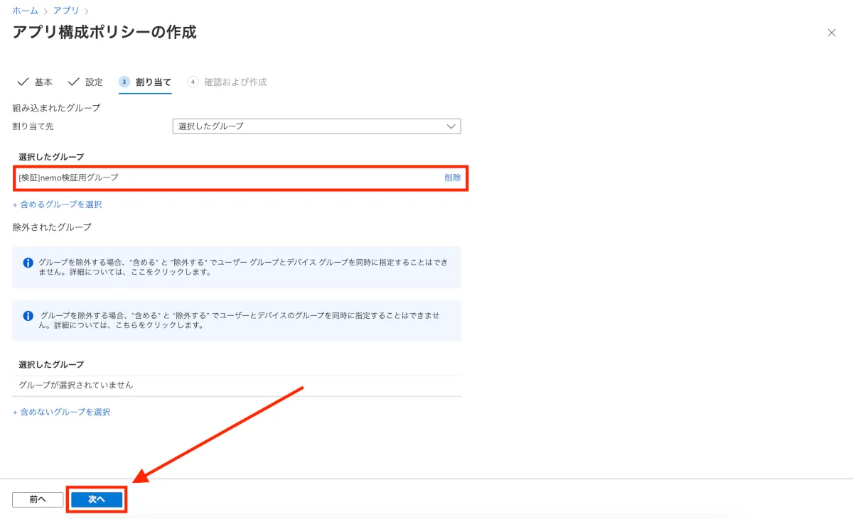 - 設定したグループが追加されていることを確認し、”次へ”をクリックします。