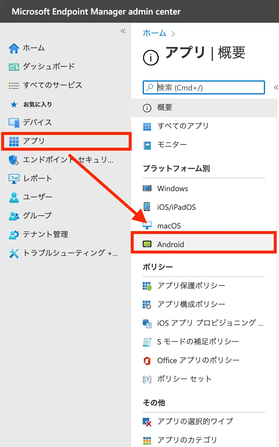 それではAndroidデバイスにMDATPをインストールしていきます。 MDATPのインストールはIntuneを介して行いますので、まずはMicrosoft Endpoint Managerにアクセスして配布準備を行います。