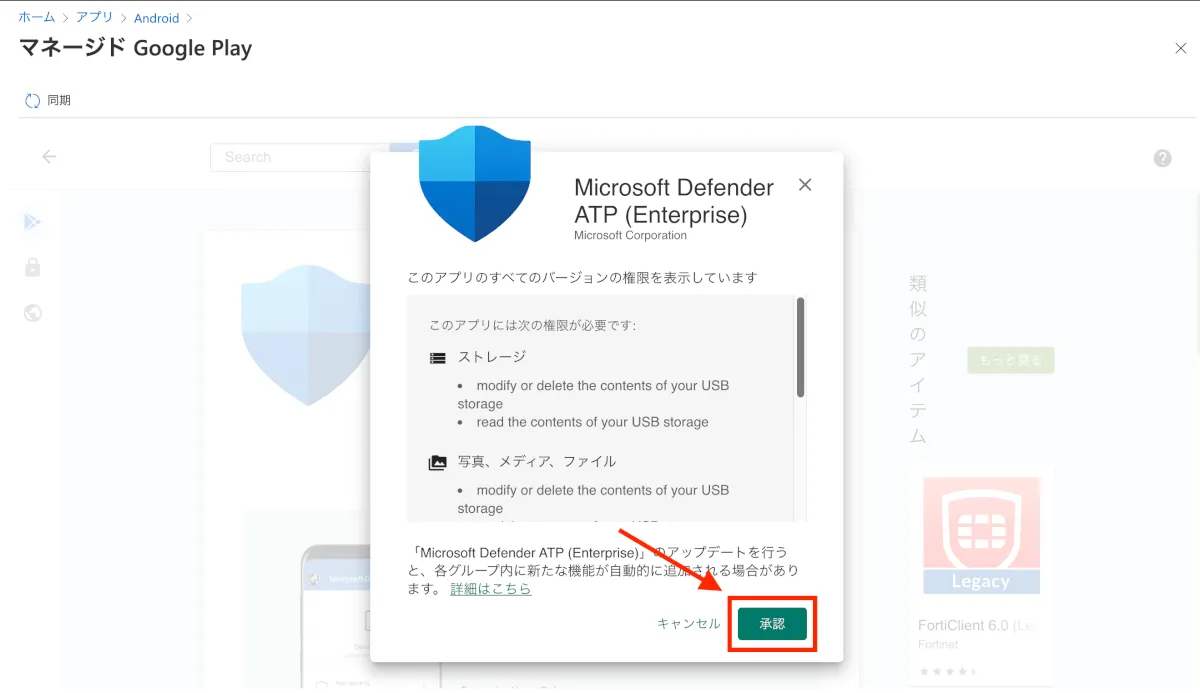 - Androidデバイスに対する権限に関する案内が表示されるので、”承認”をクリックします。