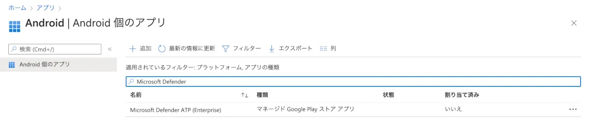 - アプリ > Android > アプリケーションの一覧画面より、「Microsoft Defender ATP(Enterprise)」を選択します。