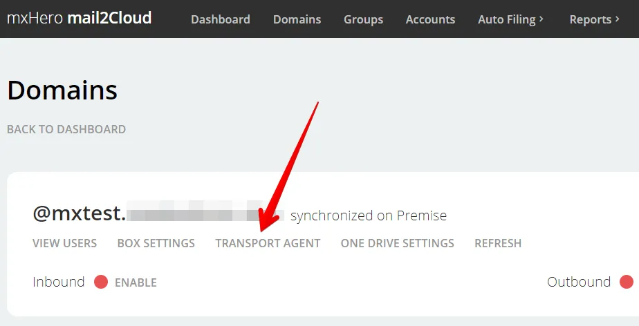 Registrationが完了したら、一度mxHero側のダッシュボード上部にある、”Domains”をクリックして開き、TransportAgentを生成します。
