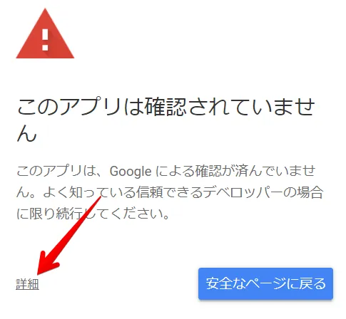 認証時に警告が出ますので、”詳細”から入って許可します。