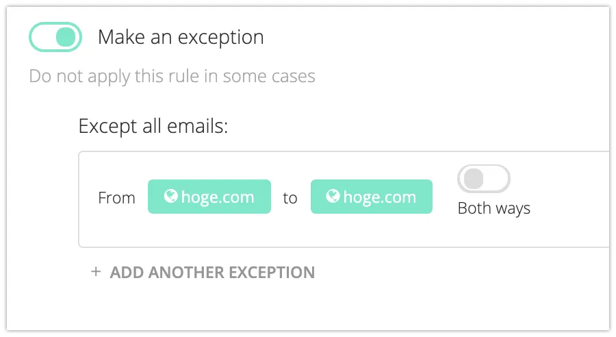なお、自社ドメイン内同士でのメールについて、Fusionルールの適用除外としたい場合は、以下のように”Advanced option”から除外条件を利用することで、自社ドメイン内でのFusionルールの適用を無効にできます。