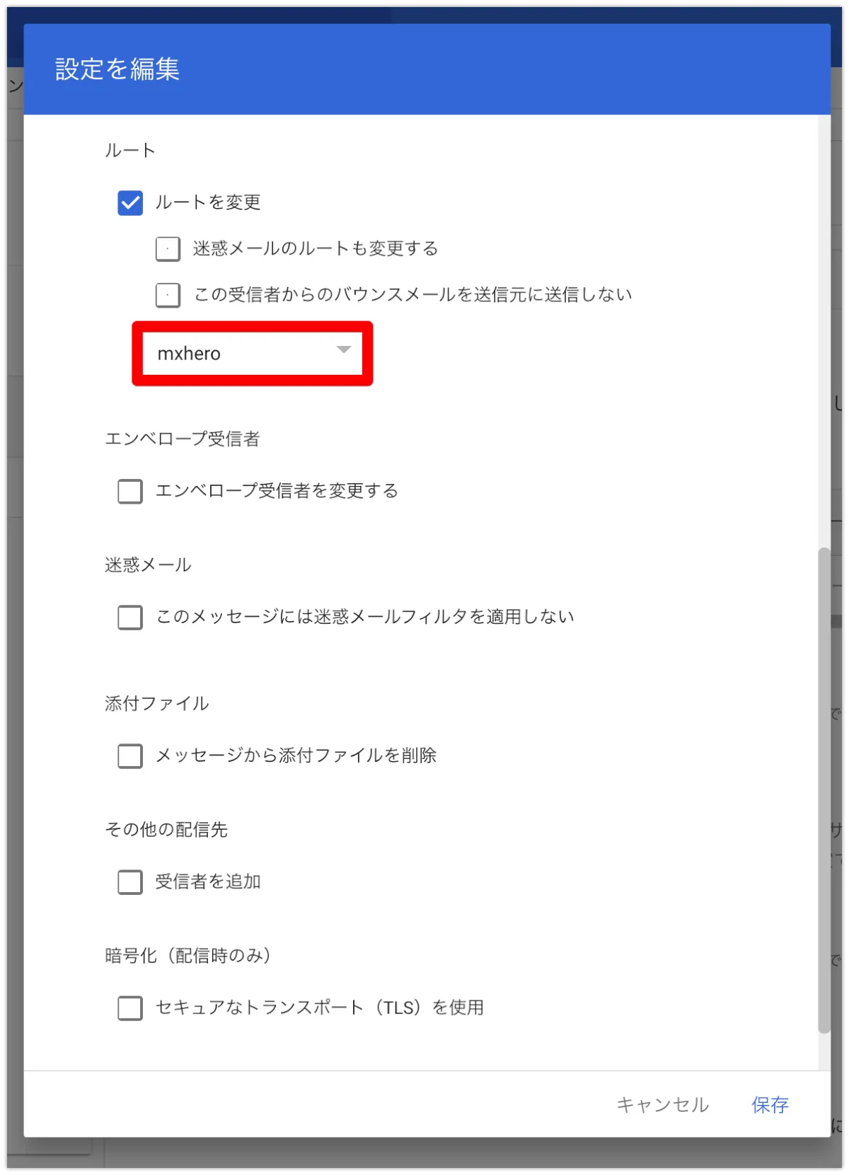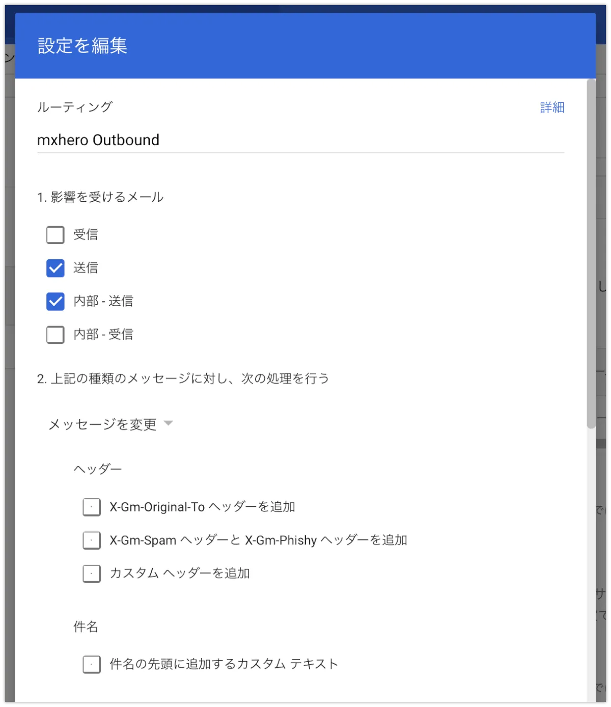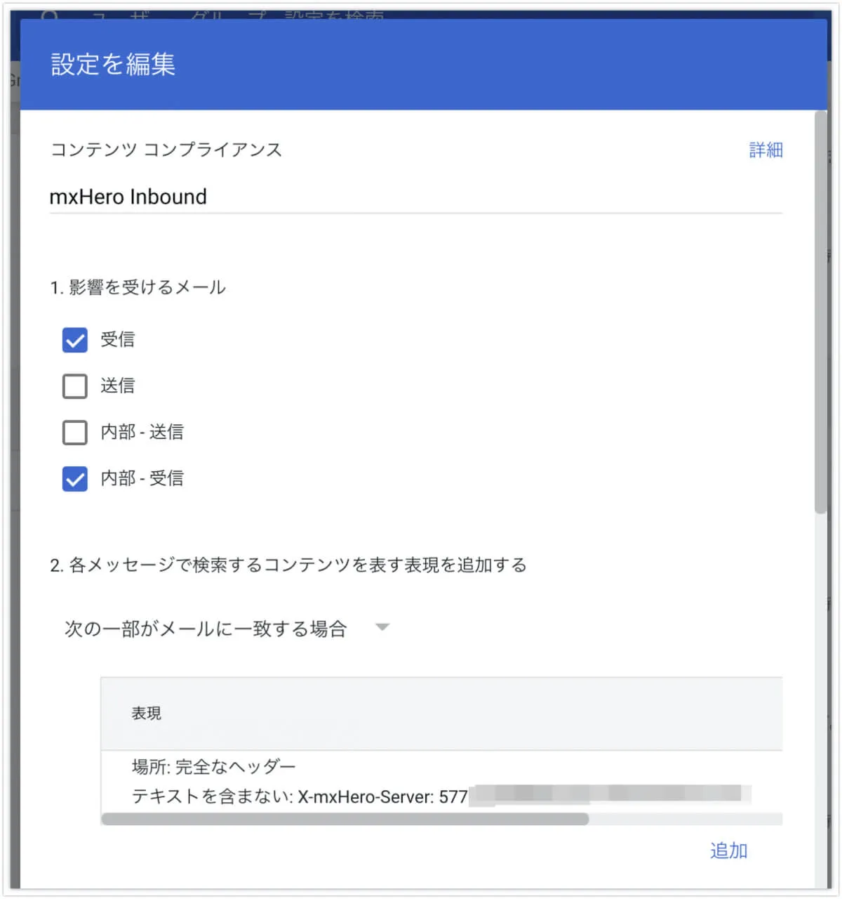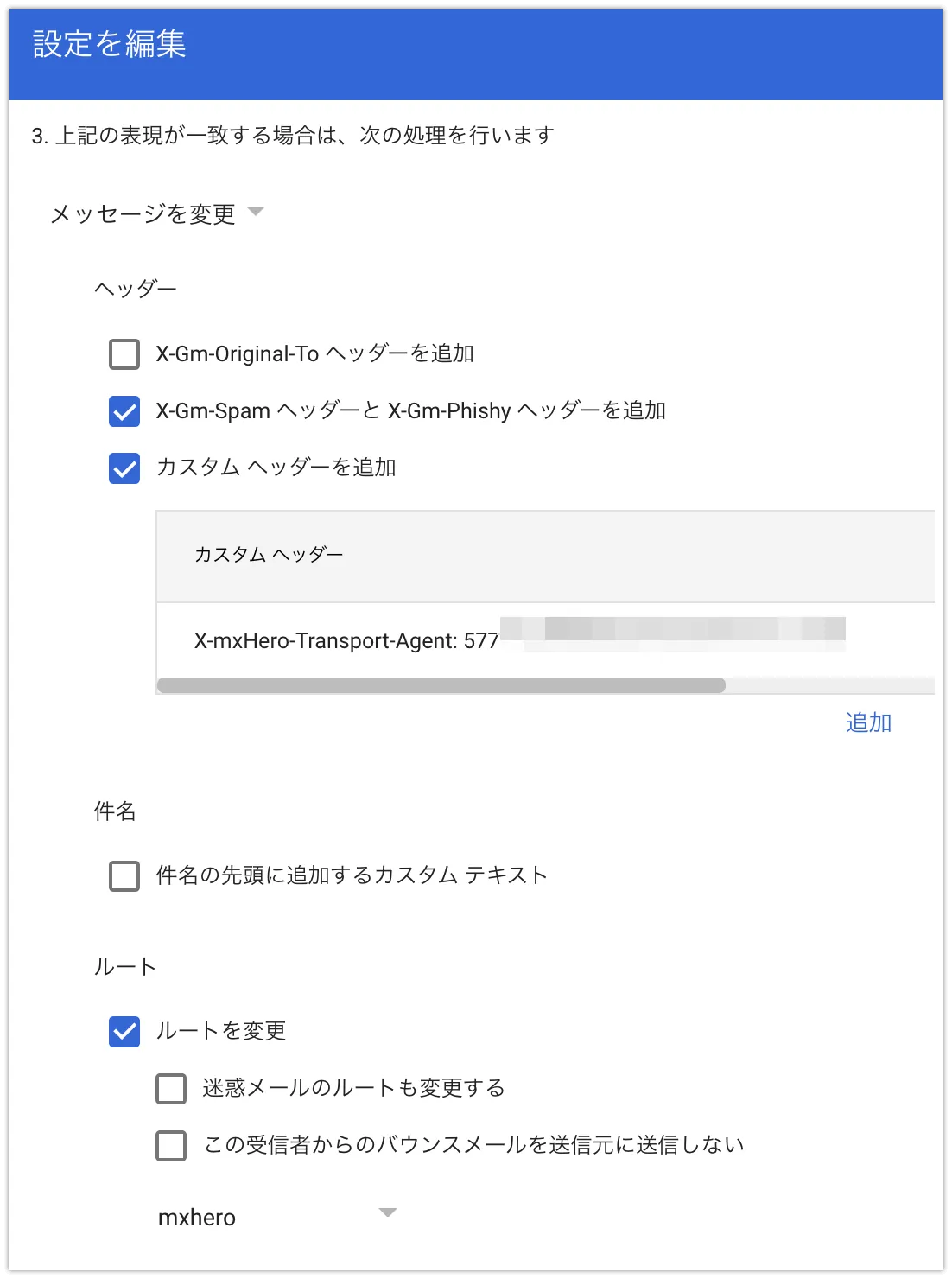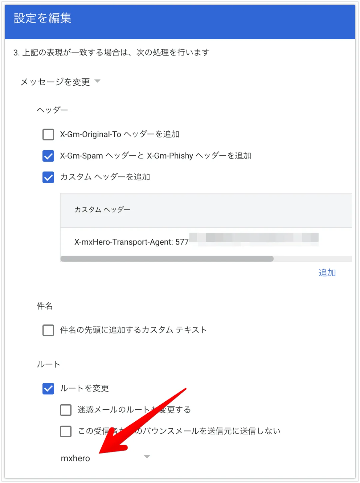 以下のカスタムヘッダーのぼかしている部分(X-mxHero-Server:以降)は、最初に取得した、トランスポートエージェントの値を入力してください。