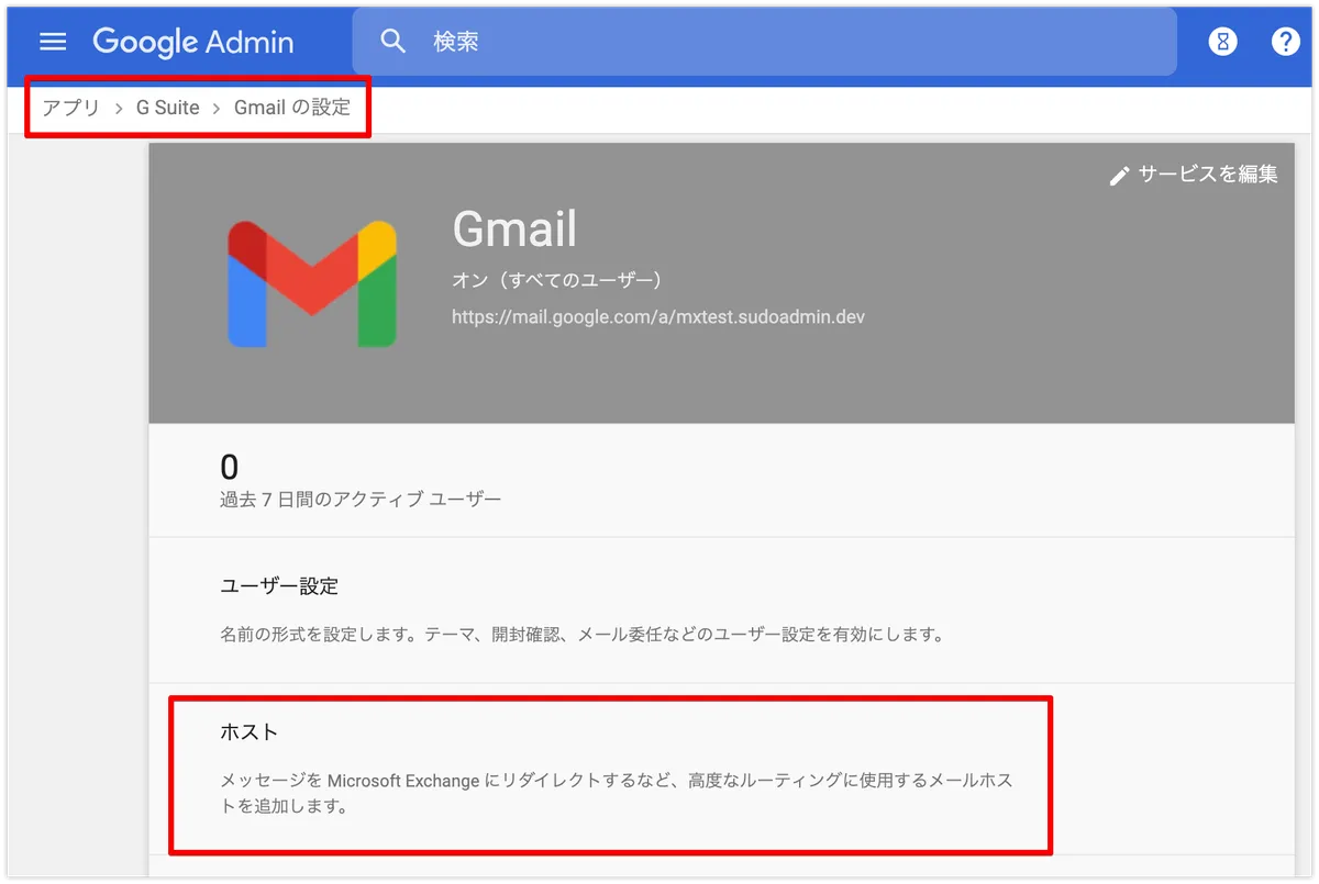 管理コンソールから、アプリ→Google Workspace→Gmail の設定に移動し、”ホスト”を開きます。