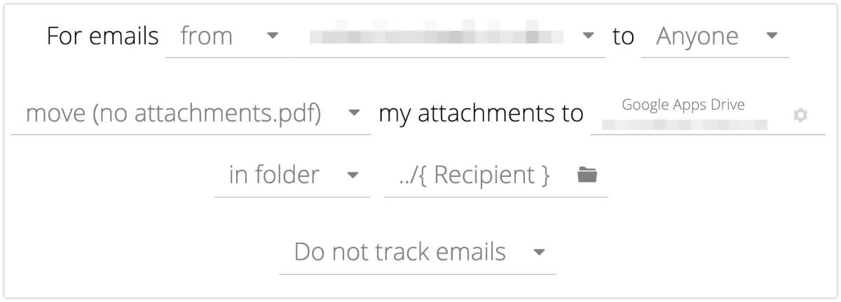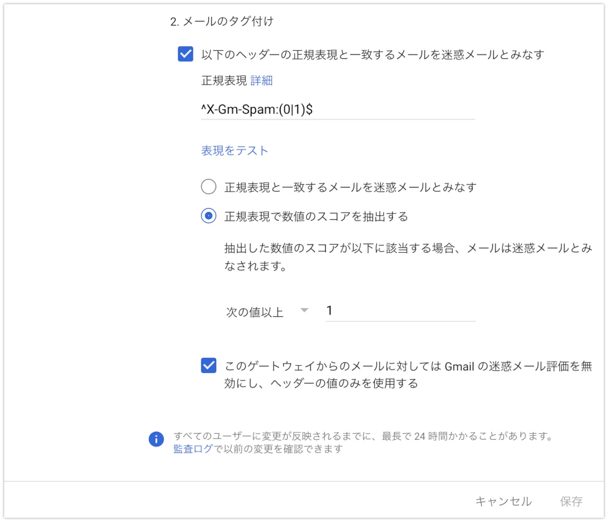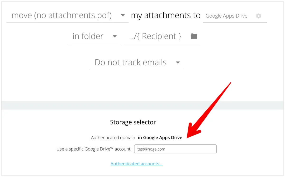 以下の設定では、設定したドメインから送る添付ファイル付きのメールは、すべて宛先を問わず、Googleドライブに格納され、通知されます。