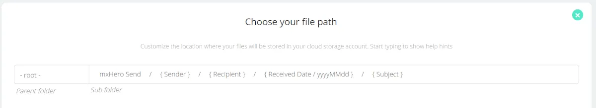 次に格納フォルダの選択です。送信と受信を分けておいたほうが識別しやすいため、このように設定しています。{}で囲まれているものは変数、/を入れるとフォルダとして認識されます。