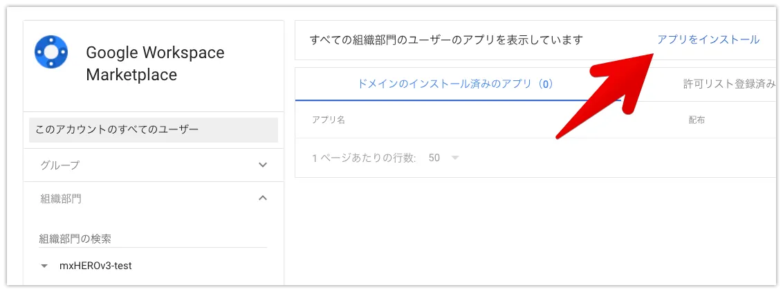 ”アプリをインストール”からmxHEROを検索し、管理者によるインストールを選択します。