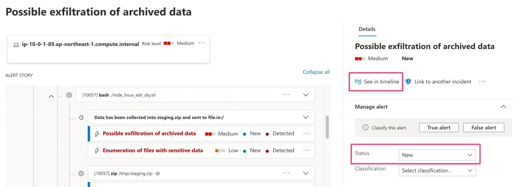 更に前後の調査が必要であればSee in timelineでデバイスのタイムラインを確認したり、Advanced Hantingからクエリをかけて調査することも可能です。今回の場合はプロセスツリーから十分に起きた事象をたどることができました。ステータスをクローズにして完了します。