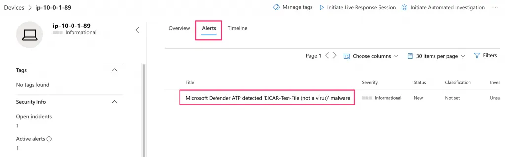 詳細を確認するとAlertsにEICARを検知したことが確認できました。