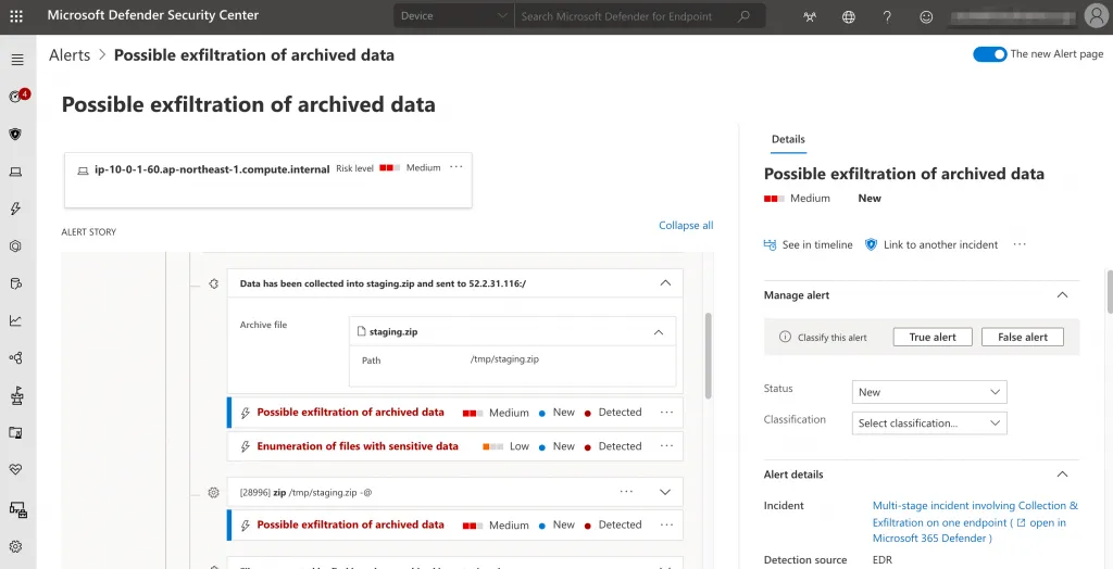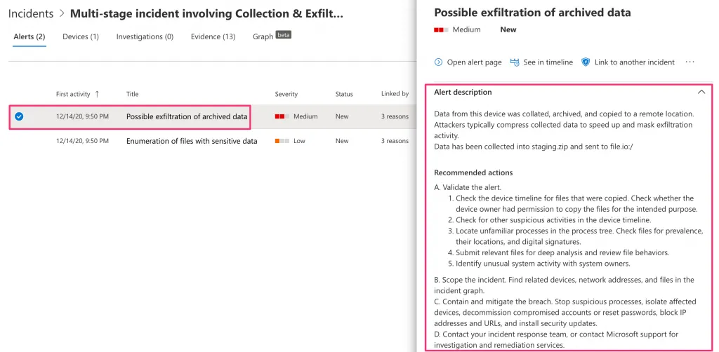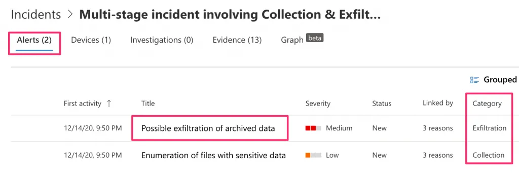 インシデントの詳細を見てみます。Alertsが2つあります。カテゴリーはExfiltrationとCollectionですね。