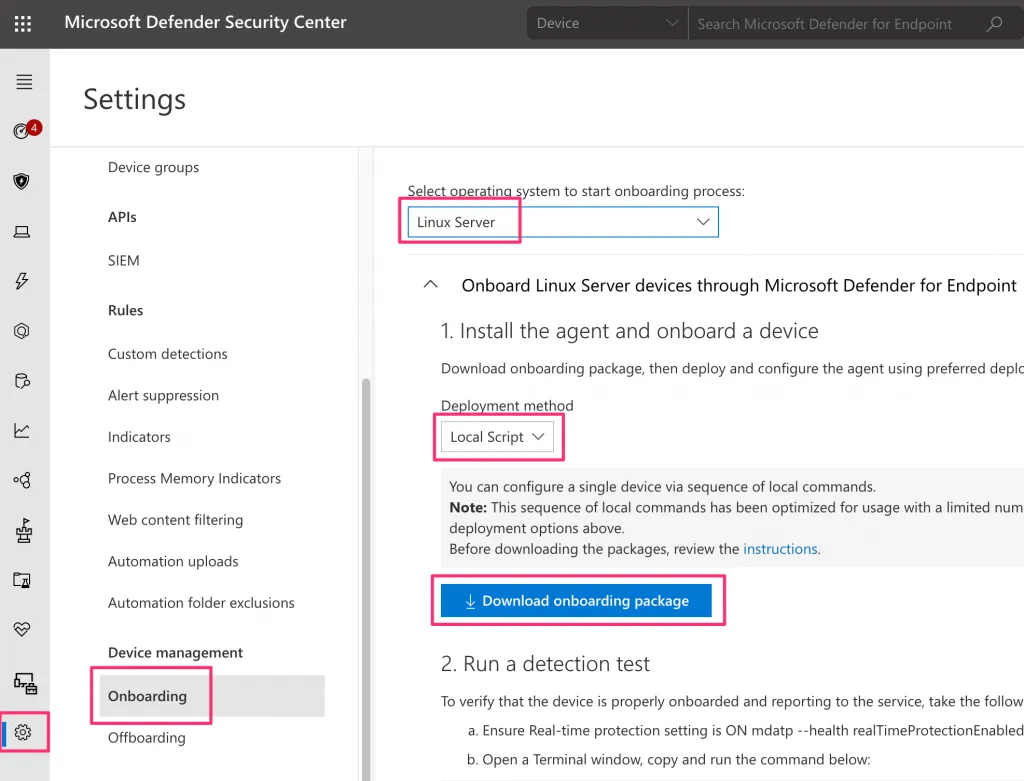 MDATPの管理コンソールにアクセスして[設定]> [デバイス管理]> [オンボーディング]からLinux Serverを選択してローカルスクリプトをダウンロードします。