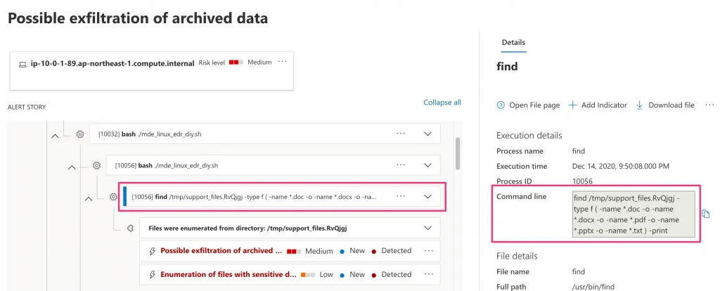 アラートの詳細を確認してみます。先程実行した./mde_linux_edr_diy.shからどのような処理がされたかプロセスツリーと供に見ることが可能です。以下のようにfindで各ファイルが検索されたり…