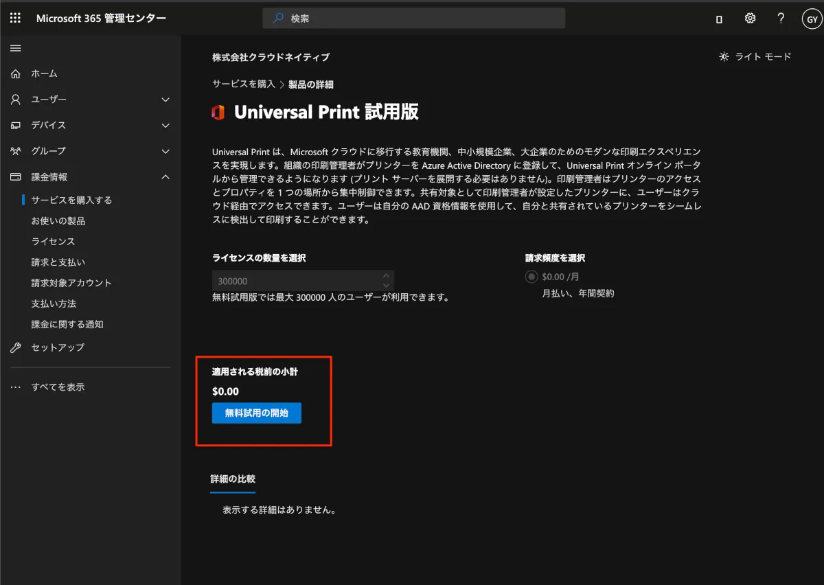 - 無料試用の開始を押すと、Universal Printライセンスが使えるようになります。